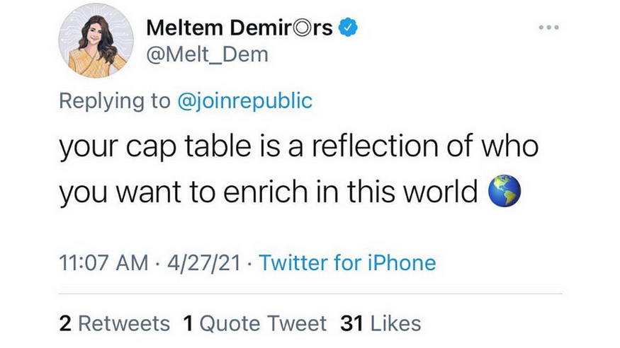 O seu cap table é reflexo de quem você quer enriquecer no mundo, ele carrega o verdadeiro DNA de sua empresa. Se queremos construir um ecossistema mais diverso, devemos começar analisando quem estamos enriquecendo através de nosso negócio. Use o seu cap table para valorizar os atores que mais contribuem com o seu sucesso; e dê às pessoas historicamente excluídas da geração de patrimônio, a oportunidade de participarem.